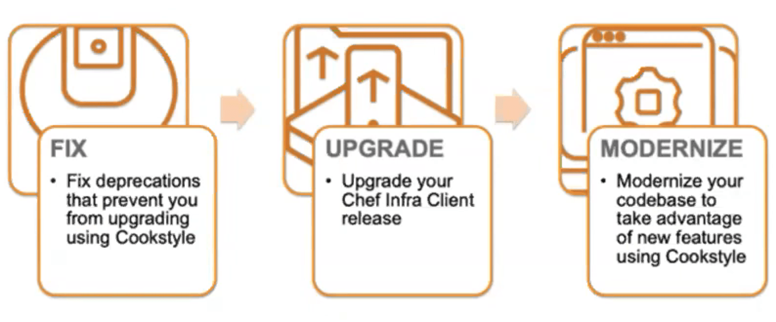 Chef Cookstyle allows error-free and optimal code-writing by evaluating your code against hundreds of custom tailored Infra Cookbook rules and automatically correcting them. Built on Rubicop, it ensures you stay on track with respect to code style, and syntax and moves you toward newer, better patterns continually. Besides syntax errors, it also facilitates easy upgrades from lower to higher versions of Chef Infra clients by running compatibility scans and prompting upgrades to available versions.