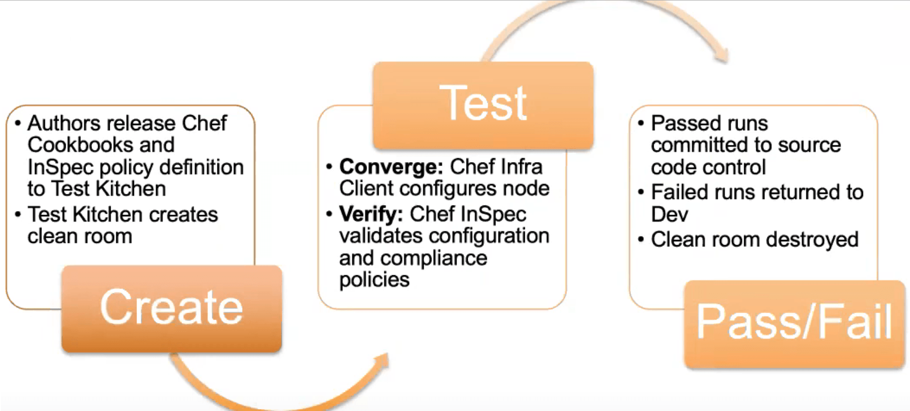 Test Kitchen has come a long way from version 2.11 that we had in ChefDK. The current version has a plethora of new functions to make testing fast and easy. Waste no more time in manually setting up test nodes when Test Kitchen can automatically do that for you. A few simple Test Kitchen commands on CLI automatically provision VMs or Cloud instances and start running InSpec tests to validate your code based on your recipes. Only the changes that pass InSpec testing are pushed to source control while failed runs are returned to Dev environment. Create, test, and commit secure and compliant code, with speed.