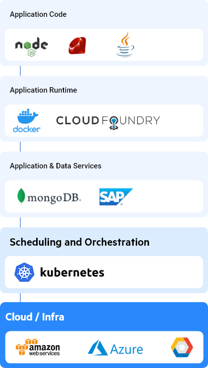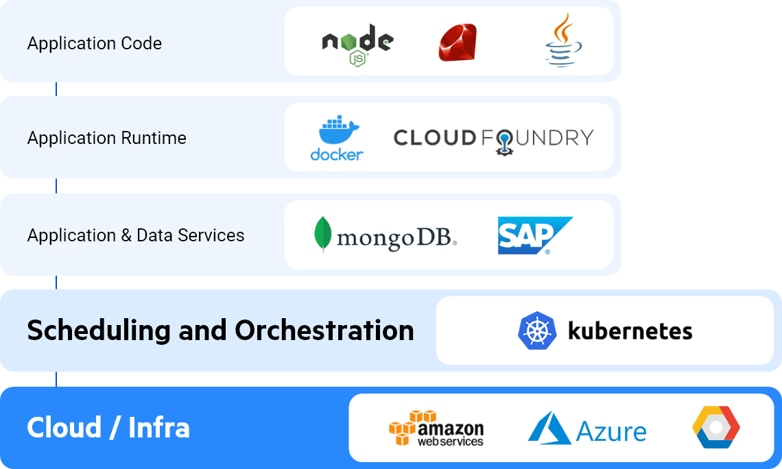 A cloud native architecture consist of five different layers, from the high-level application code, down through required runtimes and connected services. These applications and services are managed by consistent scheduling and orchestration and supervision, all of which runs on a low-level infrastructure hosted by the cloud provider.