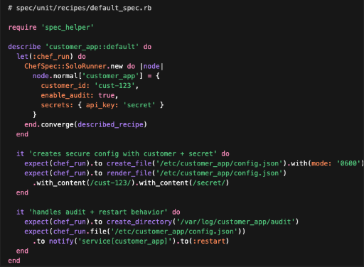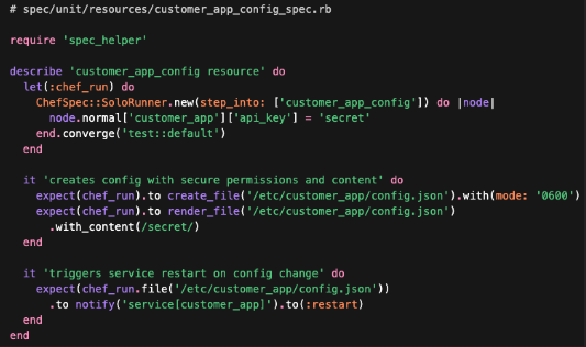 Tests a custom Chef resource (customer_app_config) instead of a recipe