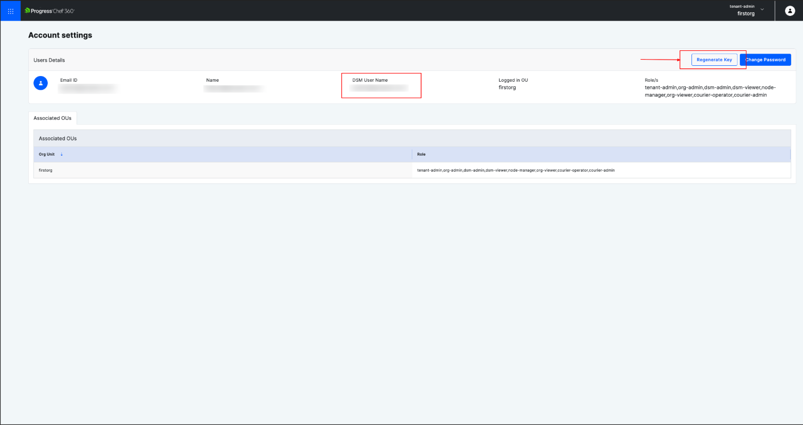 To get the client key and node name, log in to the Chef 360 UI and click on profile on the top right corner of the Chef 360 platform. Click Account settings, then Regenerate key.